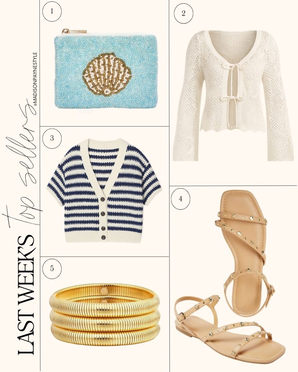 Last week’s best sellers included a $15 nautical beaded pouch, an $18 crochet cardigan, a stripe cardigan, seashell-embellished sandals, and a set of stretchy bracelets.