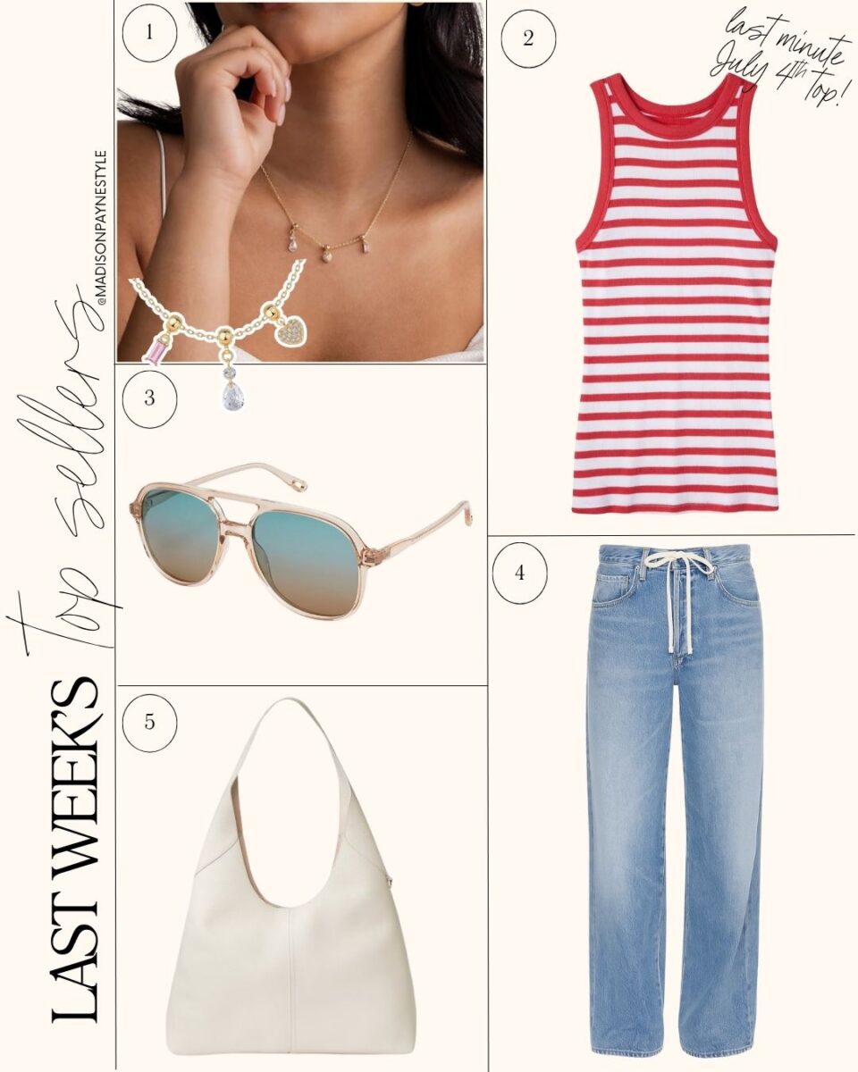 Last week’s best sellers included a charm necklace, a last-minute July 4th top, aviator sunglasses, drawstring jeans that are repeat best-sellers, and a shoulder bag that is a Coach look for less.
