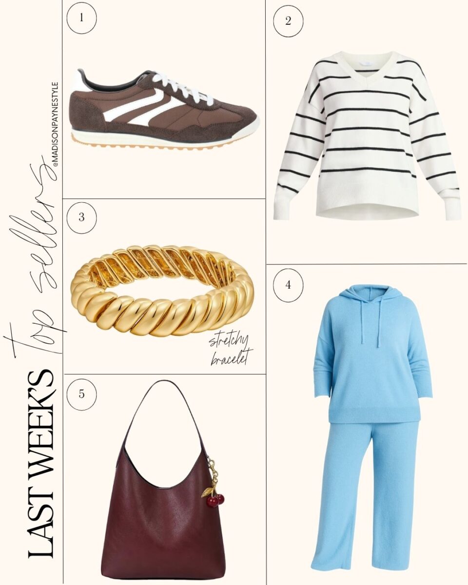 Last week’s best sellers included a pair of sneakers currently trending for fall and back to school, a lightweight sweater, a repeat best seller stretchy bracelet, a 2-piece set, and a handbag also currently trending for fall.
