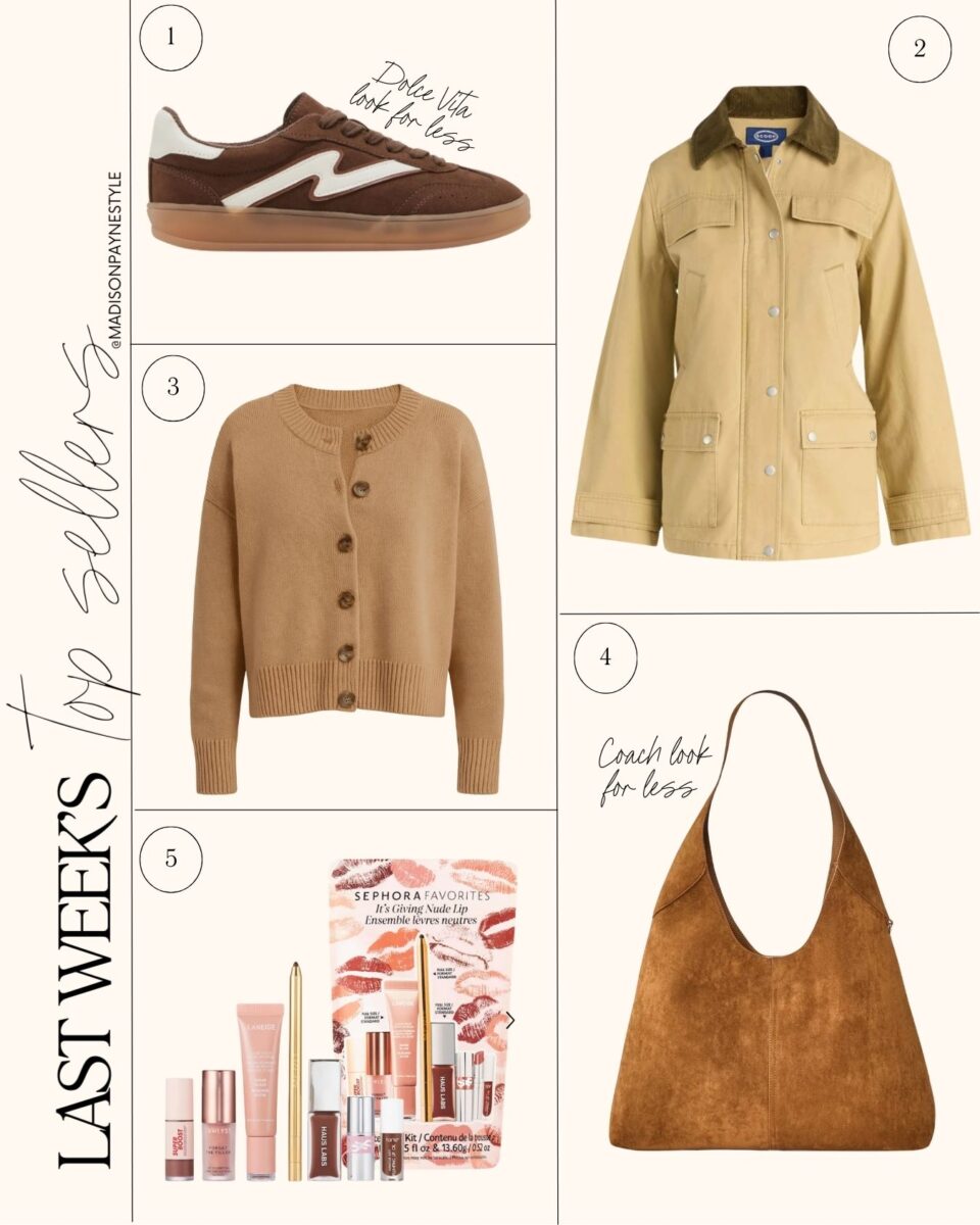 Last week’s best sellers included a pair of look for less sneakers, a $38 barn jacket, a fall cardigan, a look for less shoulder bag, and a nude lip beauty set.