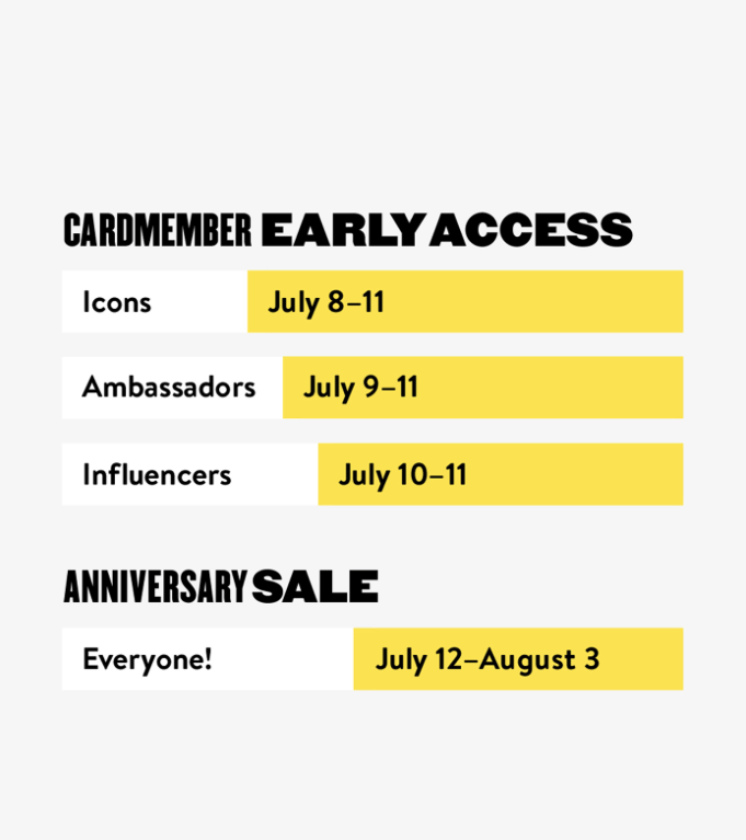 Even though the sale runs through August 3rd, don’t wait! The date that the sale opens to everyone will be one of the busiest. Use the chart below to see the date you can shop.